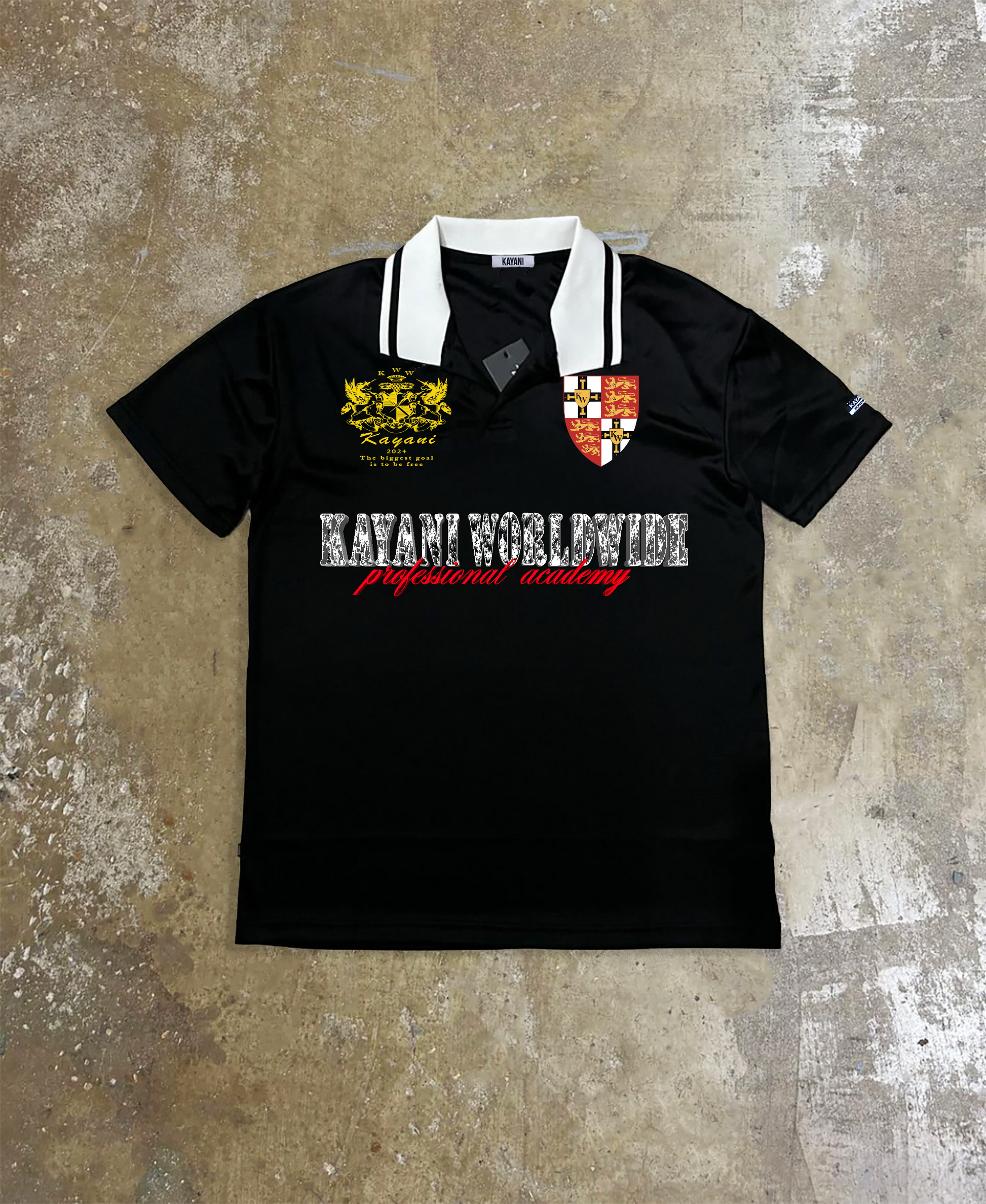 The Professional Academy Polo Jersey features a relaxed fit, sleek screen-printed design and adorned with Kayani Worldwide monogram emblems. Expertly crafted in Lagos, Nigeria for comfort and style, this polo offers a versatile look that effortlessly transitions from casual outings to professional environments depending on how you want to style it. Its quality fabric and distinctive branding embody sophistication and durability, making it a wardrobe essential for the fearless ones, as always God is our shield and $wag is our business.